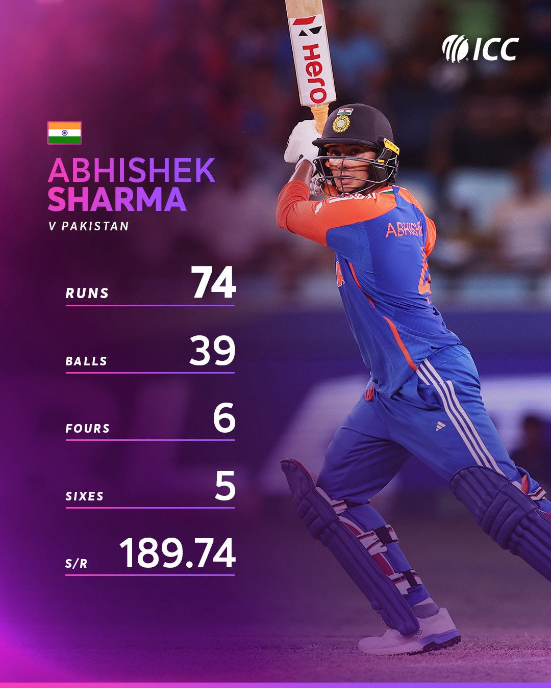 भारत की जीत के नायक सलामी बल्लेबाज अभिषेक शर्मा रहे, जिन्हें उनके विस्फोटक प्रदर्शन के लिए प्लेयर ऑफ द मैच चुना गया। अभिषेक ने मात्र 39 गेंदों में 74 रनों की धुआंधार पारी खेली, जिसमें 6 गगनचुम्बी चौके और 5 छक्के शामिल थे। उन्होंने पाकिस्तान के मुख्य तेज गेंदबाज शाहीन अफरीदी को पहली ही गेंद पर छक्का जड़कर अपने इरादे साफ कर दिए थे। यह टी-20 में उनका धमाकेदार अर्द्धशतक रहा।